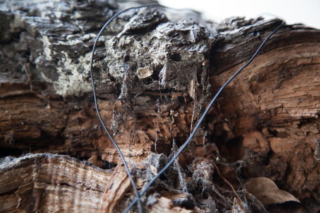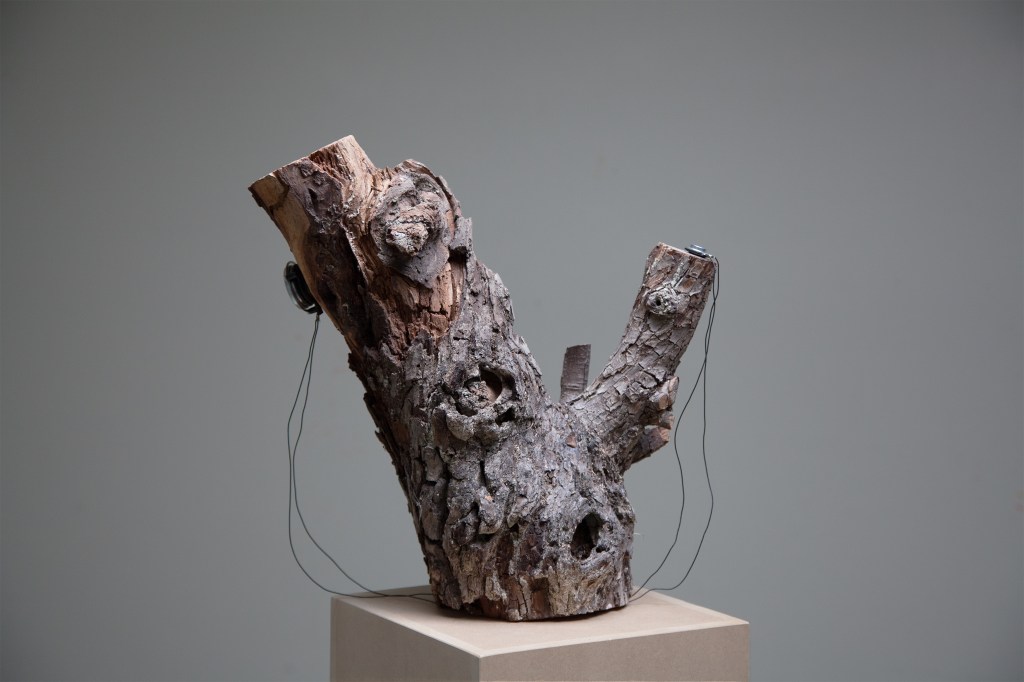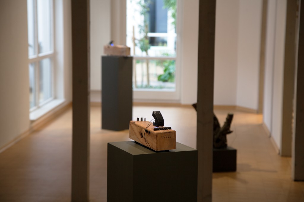 In addition to the instruments, the exhibition featured three other sound sculptures made from the tree. These play recordings of subtle movements inside the tree, like insects crawling, along with sonified bioelectrical signals registered in the moss on its trunk, while the tree was still standing outdoors.