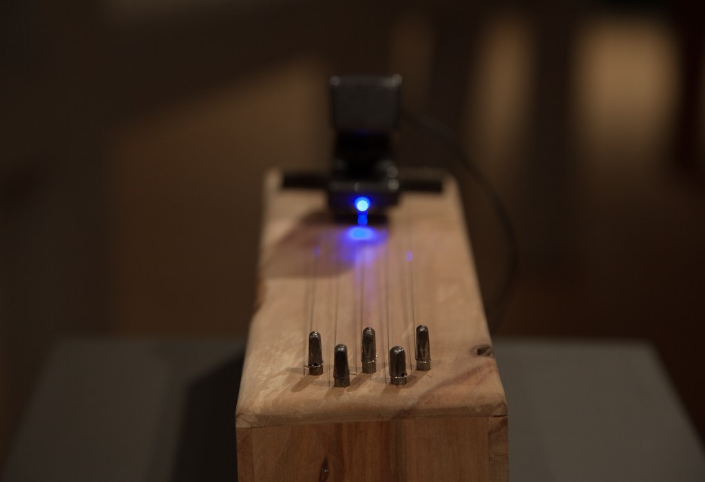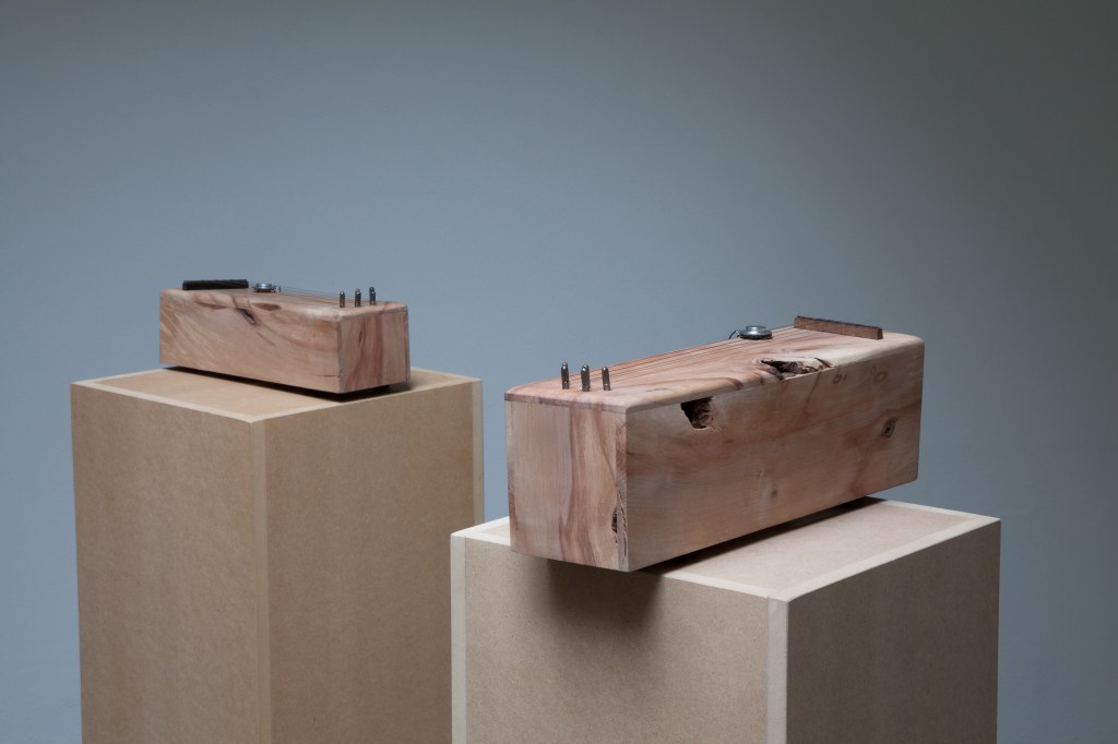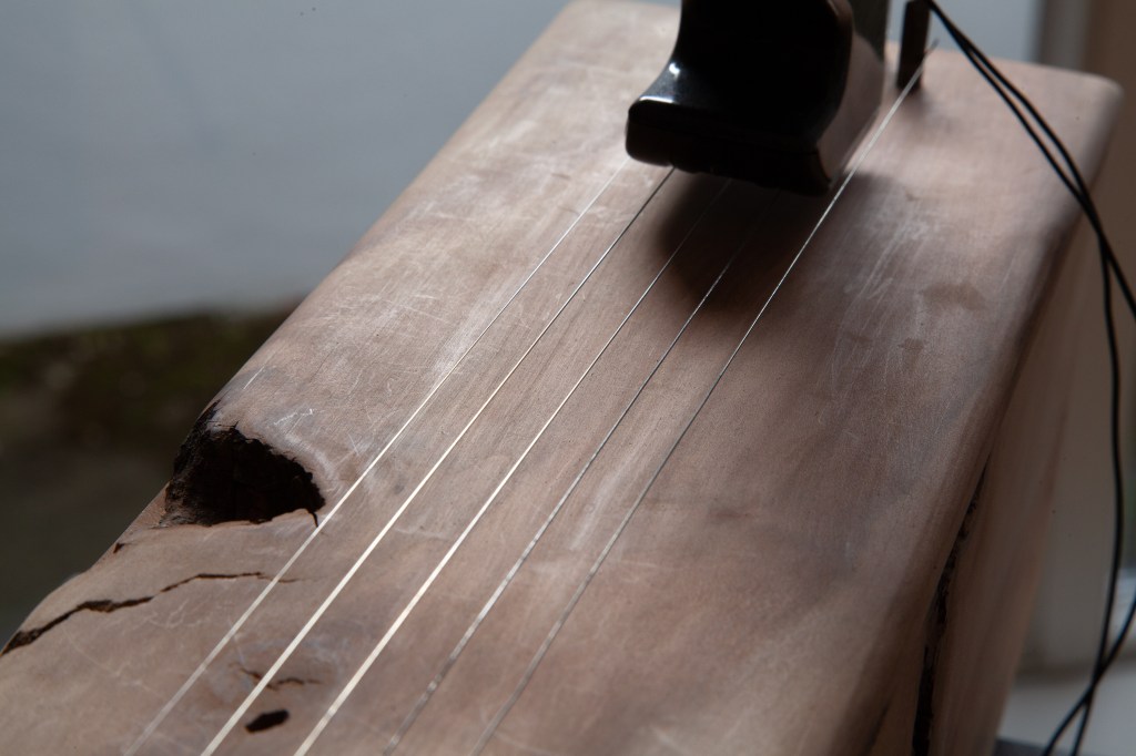 The strings of these instruments are tuned to tones found in recordings made inside the tree while it was still standing in the garden. Throughout the exhibition, the strings will resonate as they are set into motion by EBows* and electromagnets.