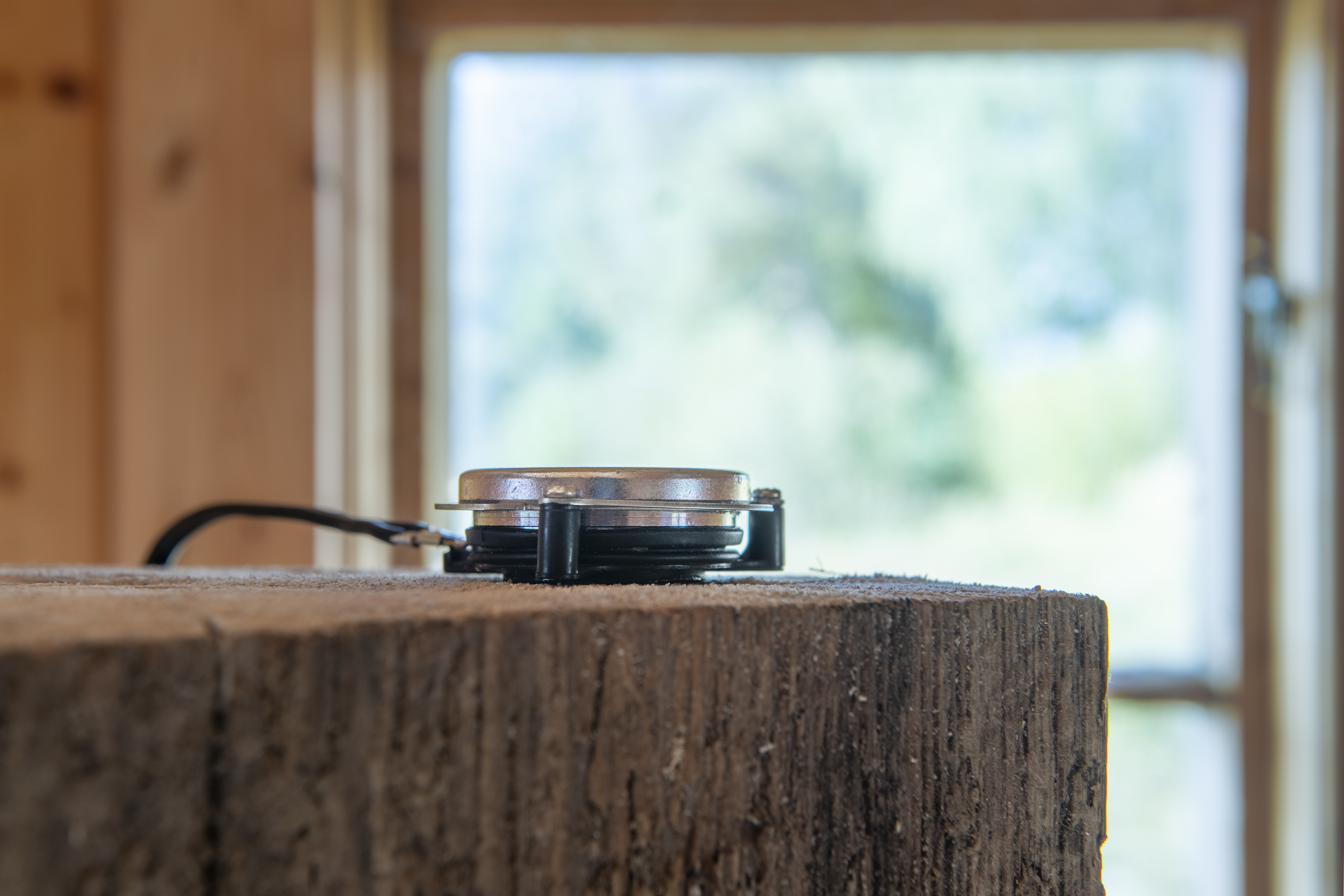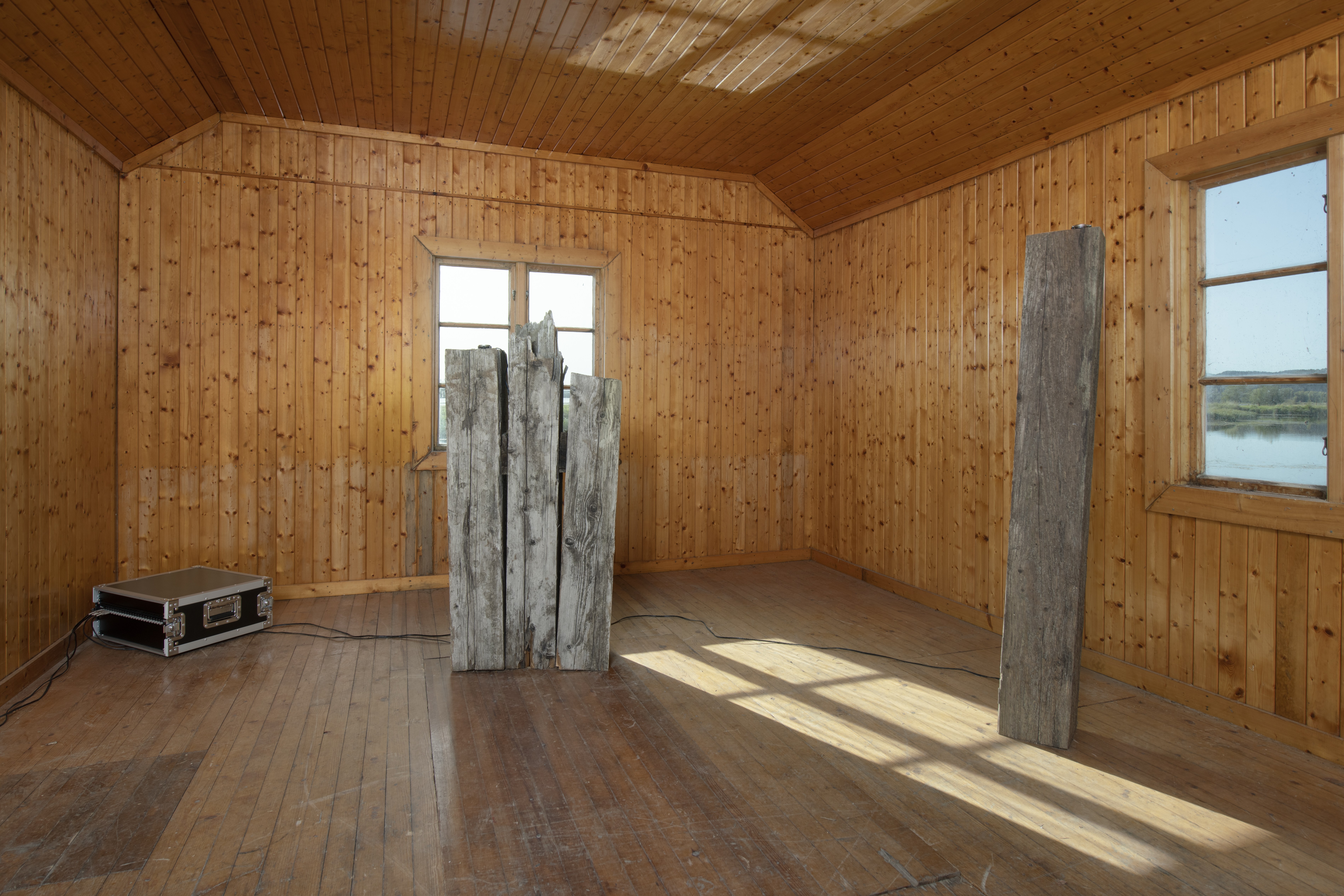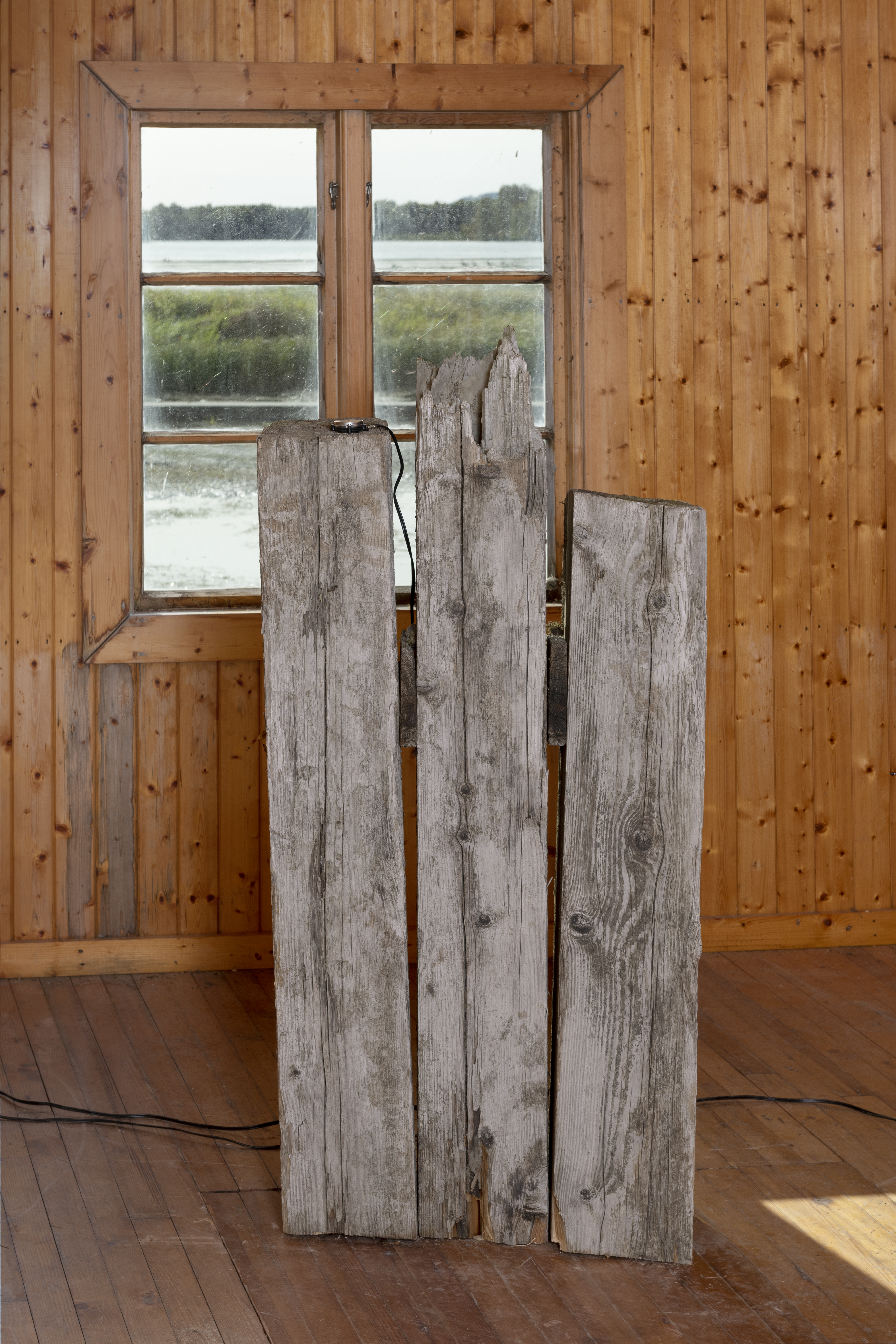 Site-specific sound installation based on audio recordings of minuscule movements in trees from the area around Fetsund Lenser, Norway’s only preserved timber-sorting facility. The installation was shown inside one of the floating huts on the river Glomma that runs through the facility. Signals from the river that the hut floats on controls the sound. Surface transducers have been attached to the installations wood, allowing the sound to be affected by the wood in real time, and making the tree an integral part of the installations speaker.
