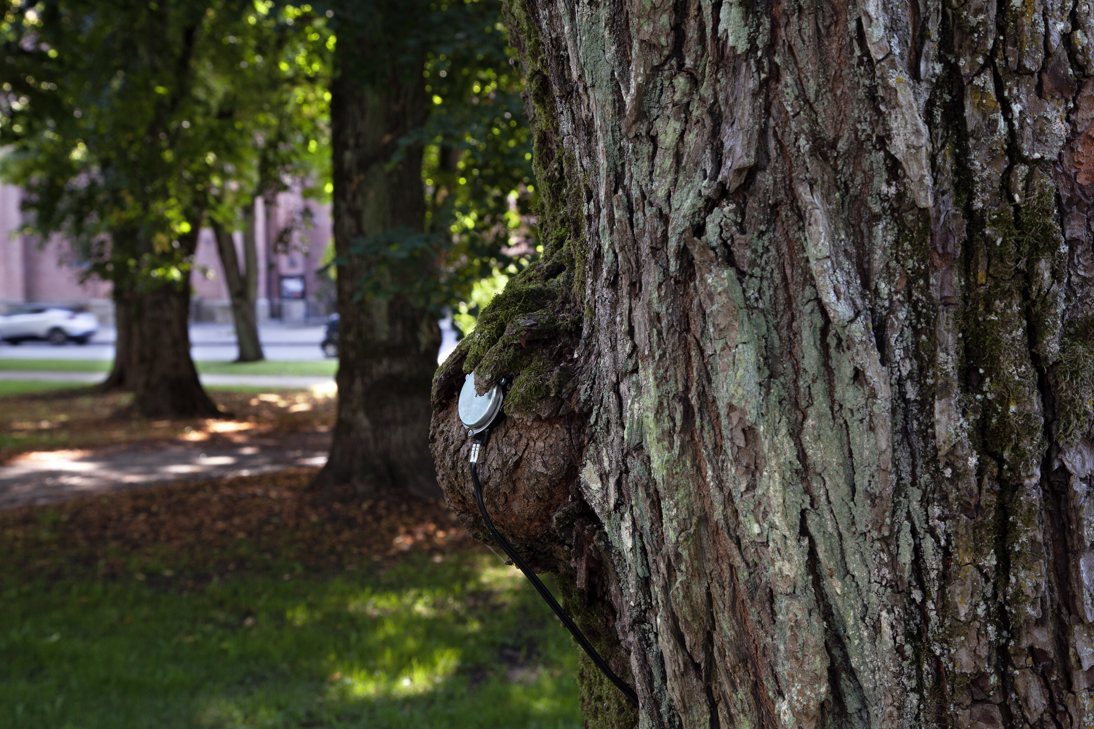 Bioelectrical signals in the trees that are part of the installation are registered by sensors that control how the sound is played back.