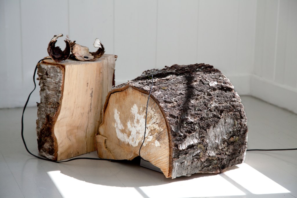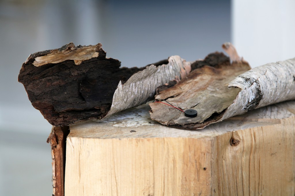 AV is a soundinstallation based on audio recordings of minuscule movements in a birch tree. Surface transducers have been attached to the piece of bark from which the recordings were originally captured, making the bark an integral part of the speakers.