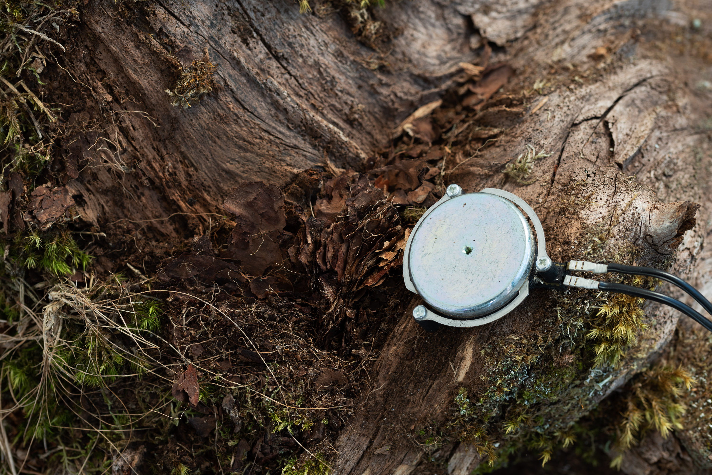 Surface transducers have been attached to the stems, allowing the sound to be affected by the wood in real time, making the trees integral parts of the installations speakers.